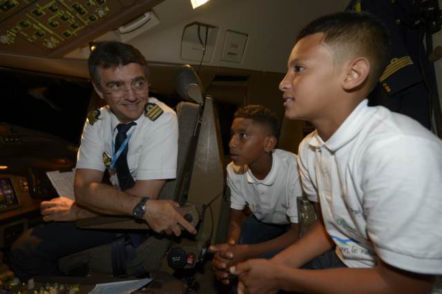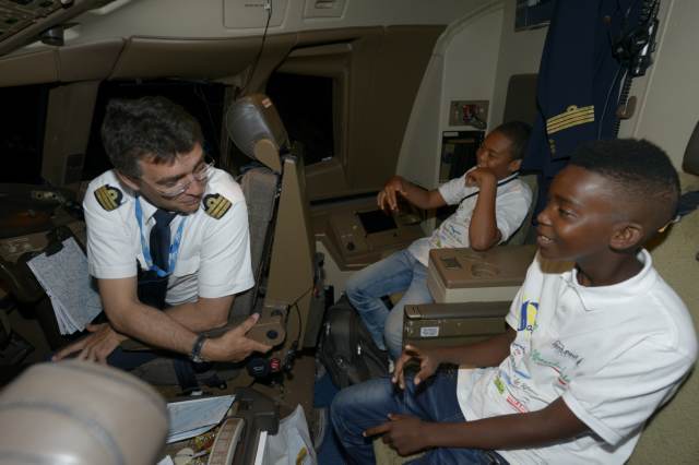 Une fois le repas servi, nos petits saint-paulois qui pour la majorité d'entre-eux n'ont jamais pris l'avion ou voyager sur une aussi grande distance, sont invités dans la cabine de pilotage. Ils découvrent toute la magie du poste de pilotage, des cadrans partout avec ses points lumineux... Sûr qu'ils en ont rêvé toute la nuit, une fois revenus à leur siège.