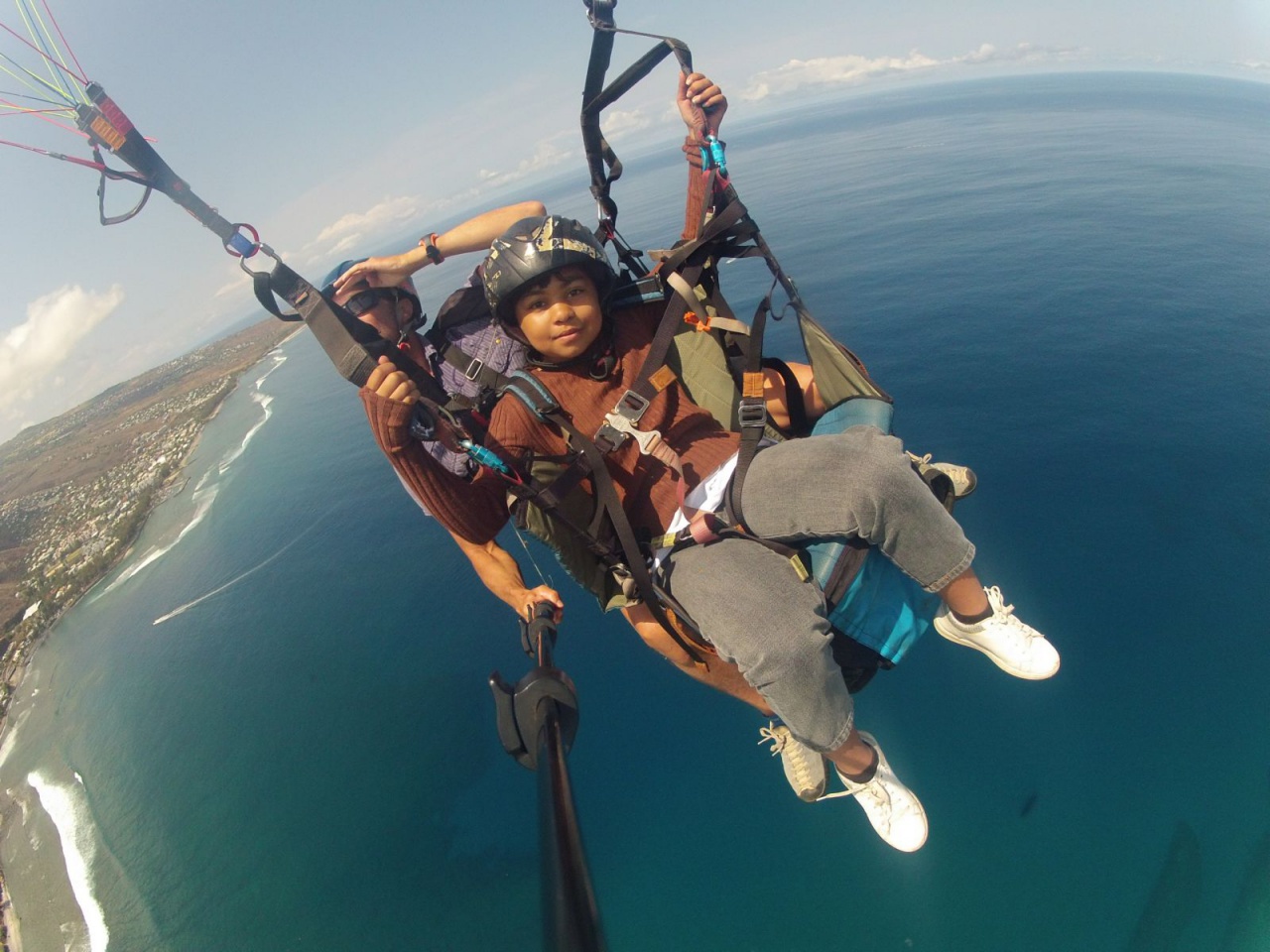 Par petits groupes, les enfants et leur parrain se sont élancés en bi-place avec un moniteur, depuis l’aire des Colimaçons, à 800 mètres d’altitude, dans les hauts de Saint-Leu. Après une vingtaine de minutes de vol, au dessus des habitations et du lagon, ils ont rejoint le littoral de Saint-Leu, pour un atterrissage en douceur, sur la plage.