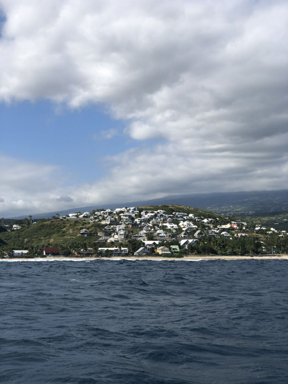 Les trois parrains ont ensuite pris le large, au sens propre comme au figuré ! Direction le port de Saint-Gilles, pour embarquer à bord d’un catamaran de Croisières et Découvertes. C’est Olivier Del Vecchio, le propriétaire, qui est à la barre, et le temps est toujours au beau fixe. “Je vous emmène longer la côte ouest de l’île, et avec un peu de chance, nous verrons des baleines”, annonce le capitaine.