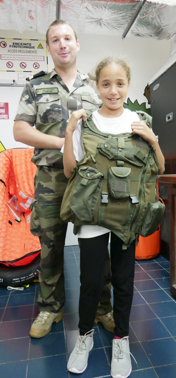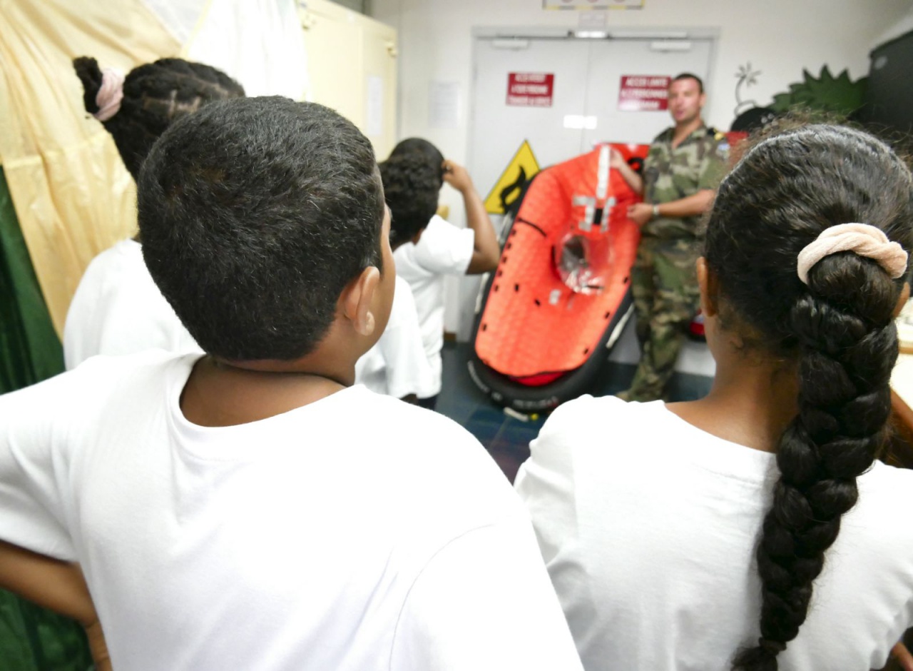 Une fois que le premier groupe a retrouvé la terre ferme, c’est au tour du second d’embarquer. Sur terre, les militaires ont également réservé d’autres découvertes aux enfants. Après avoir volé à bord du Casa, les marmailles grimpent maintenant à bord d’un hélicoptère Panther de la marine nationale. Et ils y montent avec style : les lieutenants de vaisseaux Desormeaux et Binachon leur proposent de les hélitreuiller à bord! Ils passent ensuite derrière les commandes, inspectent les écrans et enfilent les casques des pilotes, le sourire aux lèvres. Une fois descendus de l’hélicoptère, les VIM sont accueillis par le sergent chef Charbit, pour un atelier “sauvetage et recherche en mer” (Samar). Cette fois, ils découvrent les équipements qui permettent aux militaires de survivre en milieu hostile, ou de secourir des naufragés en mer.