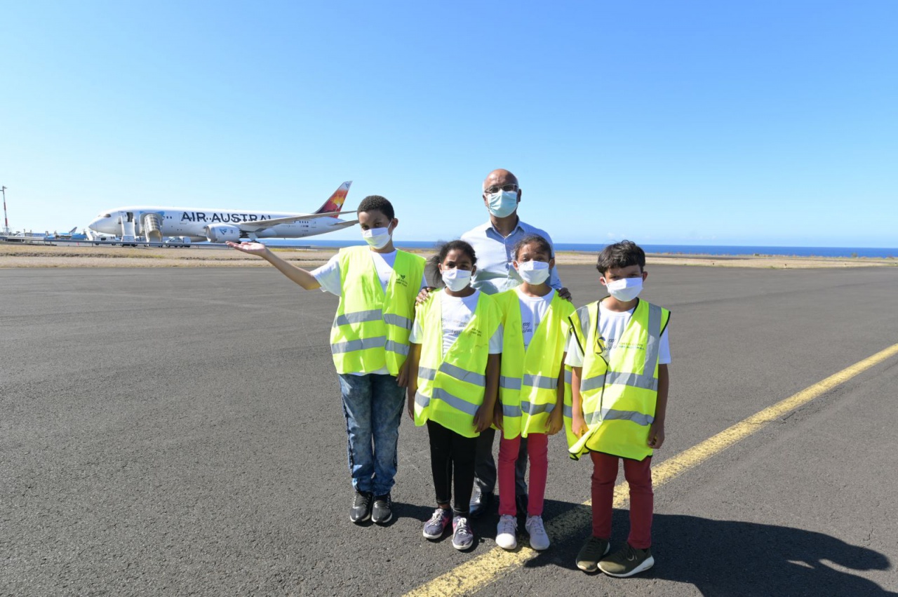 Ils ont ensuite débarqué, avec les yeux bandés au siège de la compagnie régionale, à l’aéroport de Sainte-Marie. Sur place, ils ont été accueillis par les équipes d’Air Austral : Stéphanie Bégert et Emmanuelle Naoures, du service communication, ainsi qu’un pilote, un steward, et une hôtesse, venus spécialement pour chouchouter les enfants et répondre à toutes leurs questions.