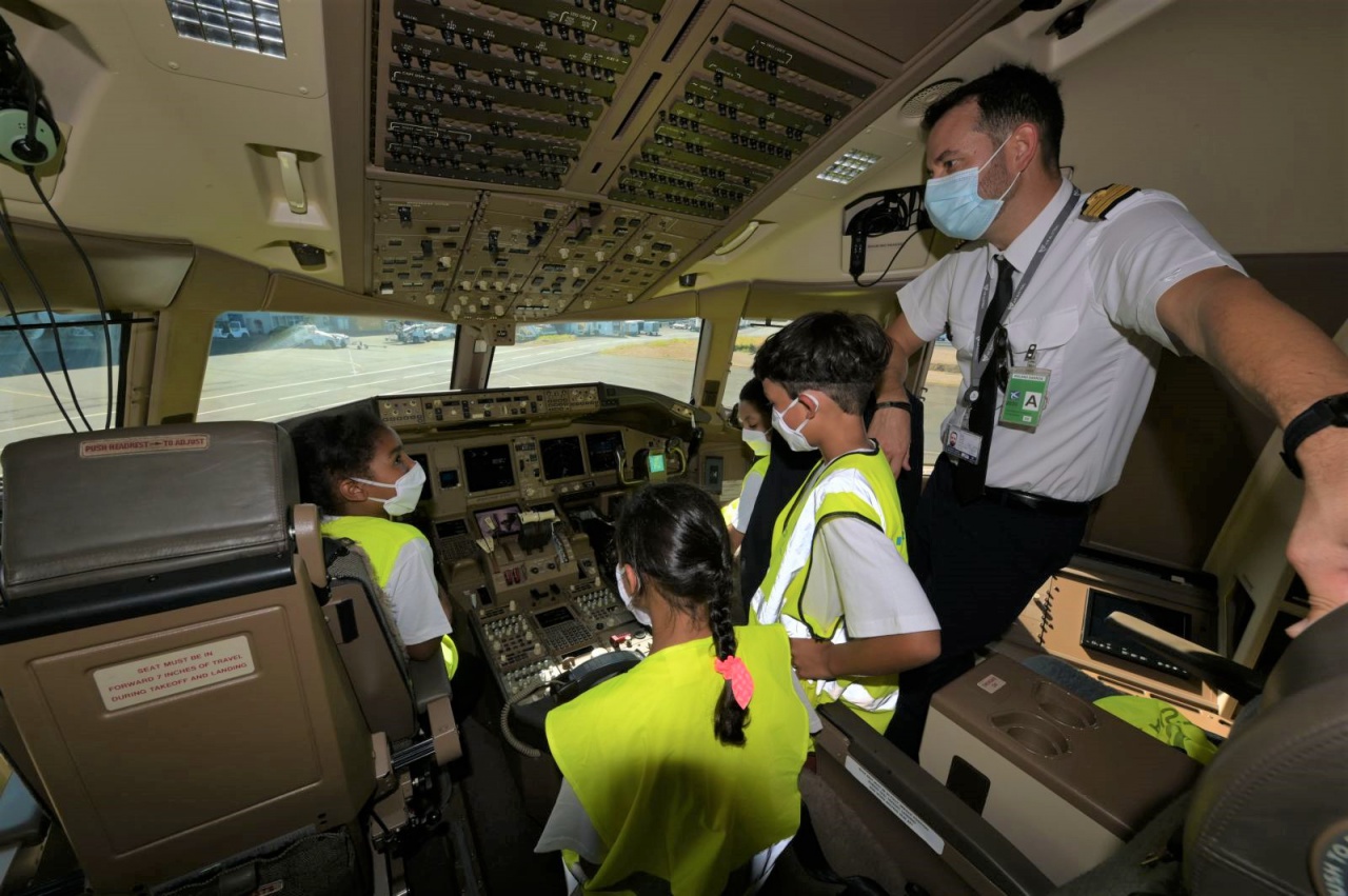 Une fois leurs masques enlevés, les enfants se sont retrouvés face à l’immense Boeing 777. « Nous leur avons prévu une visite très privée avec nos équipes, résume Stéphanie Bégert, responsable de la communication de la compagnie Air Austral. Le but est de leur permettre d’en apprendre davantage sur l’avion, sur le déroulement d’un vol ou encore sur nos métiers. Nous allons tout faire pour qu’ils s’amusent et qu’ils passent un super moment, sous le signe de Noël ». Marie-Joseph Malé, Président Directeur de la compagnie réunionnaise, est également venu saluer les enfants et prendre quelques photos avec eux.