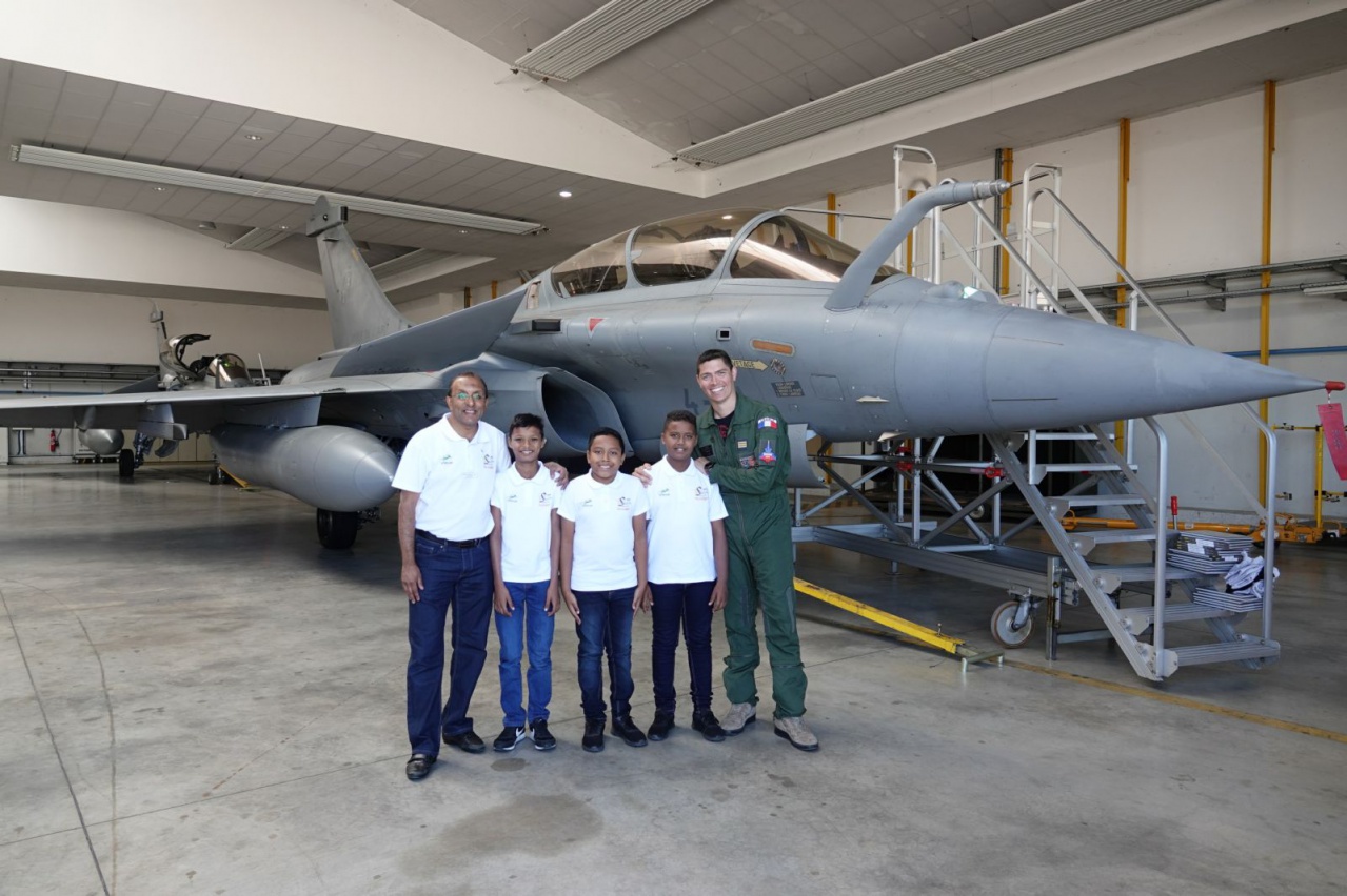 Dès leur arrivée à la Base Aérienne 113 de Saint-Dizier, le pilote de Rafale réunionnais Sébastien Nativel, surnommé Babouc, a présenté « Groom », un jeune pilote lui aussi originaire de la Réunion, aux enfants de 1000 Sourires. “Ici, c’est comme un grand village avec plus de 2000 personnes et 45 avions”, chiffre Sébastien Nativel.