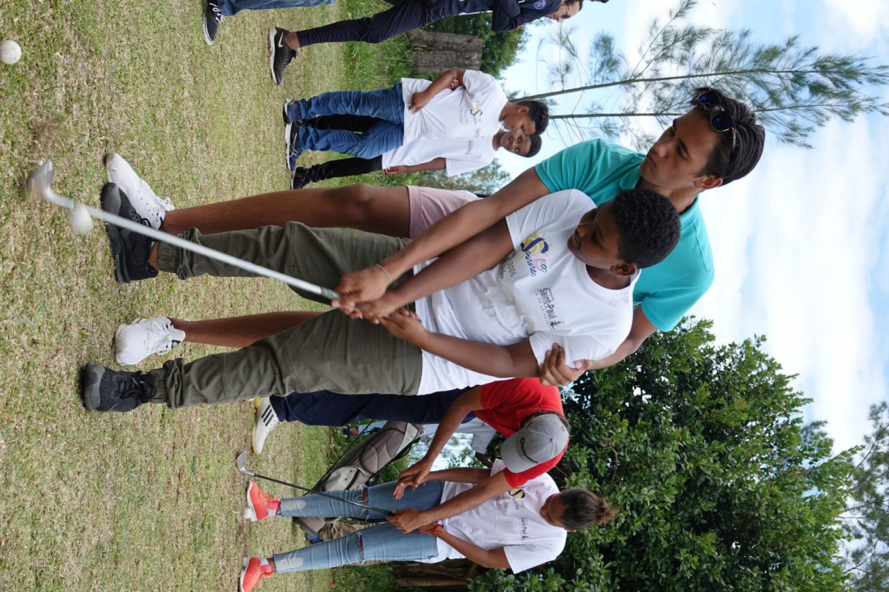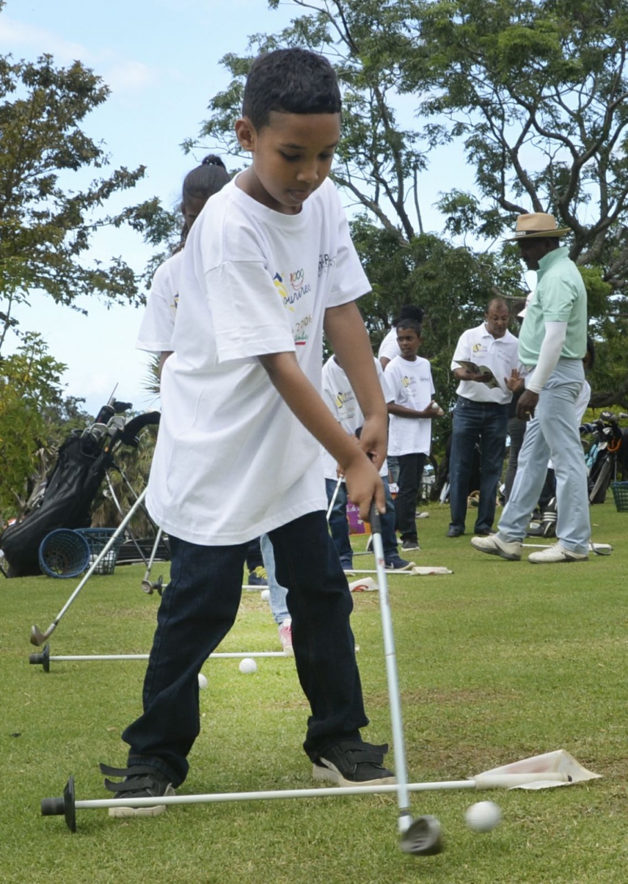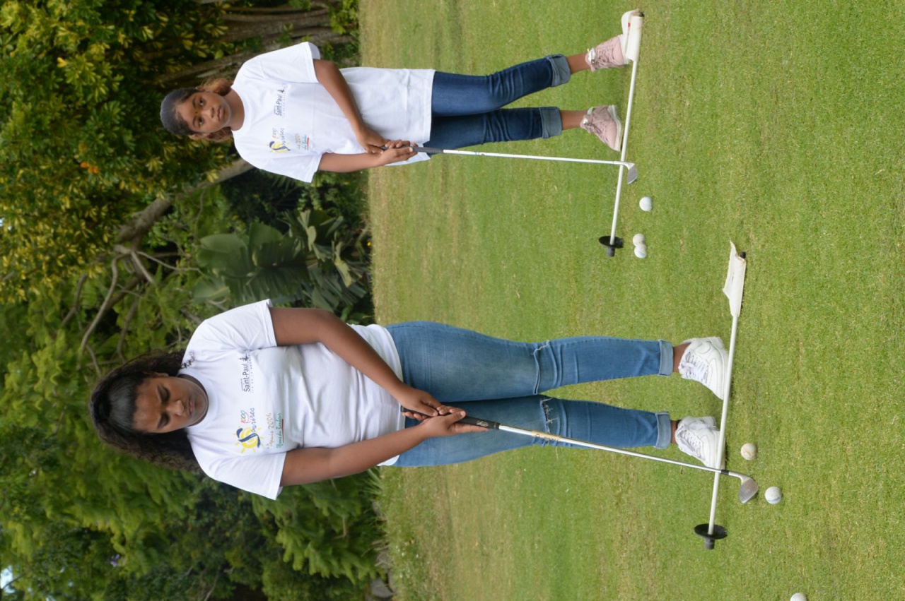 “Come over here Océane, on va “putter”, commence Vishnoo SEENEEVASSEN, dans un mélange d’anglais et de français, avec un accent Mauricien. Ce prof de golf, qui donne des cours à Maurice, prend l’atelier très à coeur. “D’abord, il faut apprendre à bien tenir le club, détaille-t-il. Tu mets ta main gauche en haut, la droite en dessous, et tu te places bien en face du trou, les pieds légèrement écartés. Et maintenant, tu tapes, en douceur”. Océane se concentre… et rate son coup ! La balle, frappée trop fort, ressort. Même si le trou est proche, pas facile de maîtriser la trajectoire et la puissance de ses coups pour ces petits débutants ! Mais grâce aux conseils de leurs profs d’un jour, les marmailles sont de plus en plus nombreux à atteindre leur but.